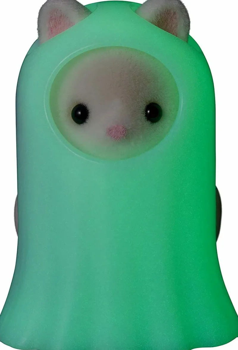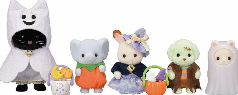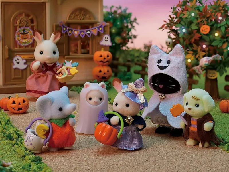 Set contents: Baby elephant (pumpkin), baby poodle (green monster), baby elephant (pumpkin), baby chocolate-covered rabbit (wizard), baby silk cat (glowing ghost), bucket (pumpkin), bucket (ghost), 4 candy bars